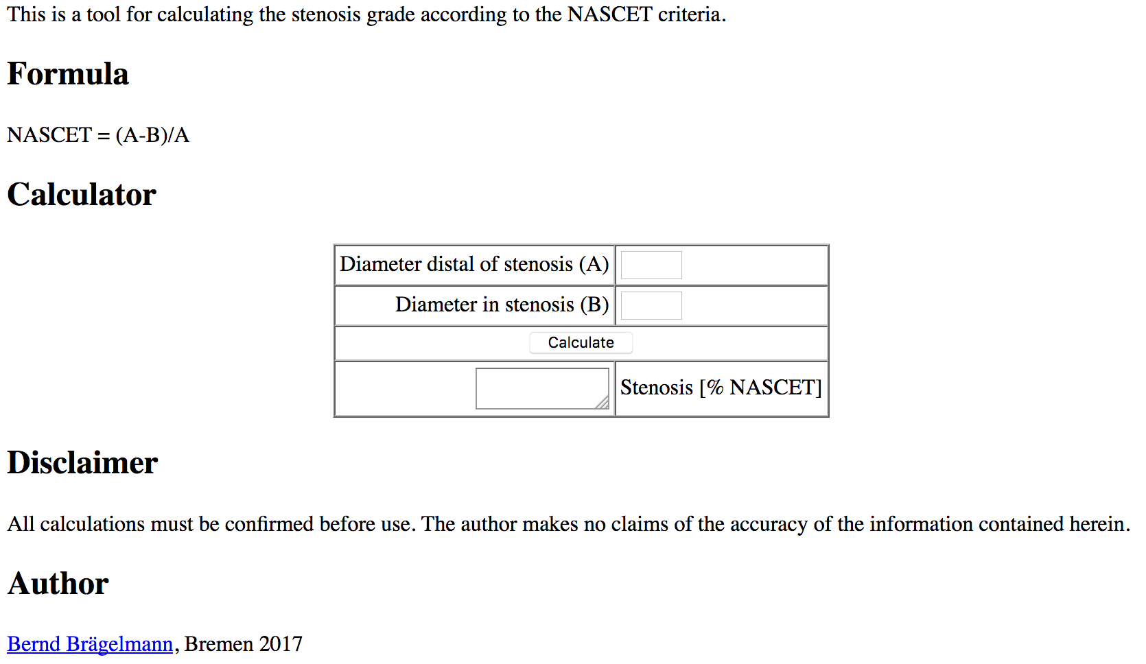 Stenosegrade sollen nach NASCET angegeben werden. Ich habe daher mal einen kleinen NASCET Calculator programmiert.